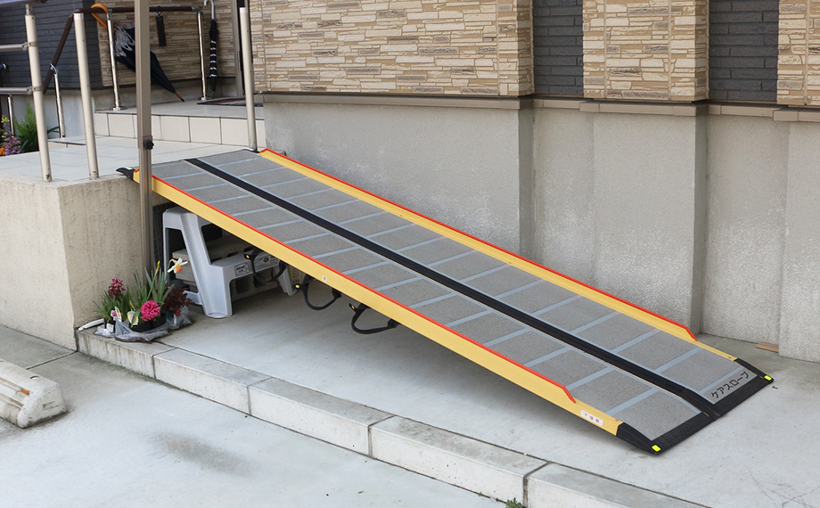 ご自宅の玄関に高い段差がある場合や、スロープのない階段しかない場所でも、この2メートルまで伸びるスロープを使えば、車イスのまま安全に外に出られます。